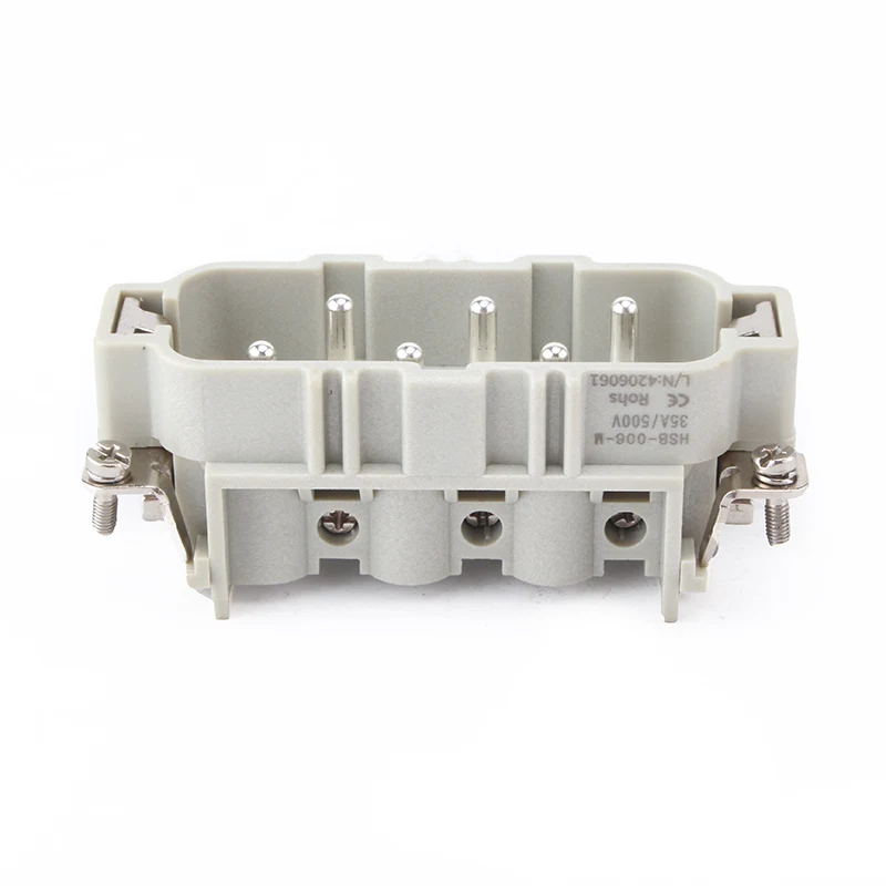 HSB-006-M Złącza HSB do dużych obciążeń pracują pod prądem 35 A. 6-pinowe złącze wkładkowe o dużej wytrzymałości .35 A ma 6 pinów lub podwójne 12 pinów do styku z przewodami. Oferuje różne warunki pracy i jest popularny w przemyśle automatycznym oraz rodzajach połączeń okablowania maszyny.