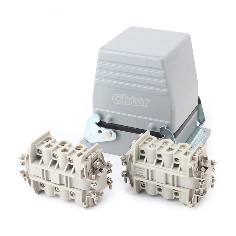 6-pinowe złącze o dużej wytrzymałości 35A jest wykonane z aluminium H16B. Obudowa złącza o dużej wytrzymałości. Wykonany jest z wytrzymałego materiału PC i mosiądzu posrebrzanego. Mosiężne kołki CHTAR są powlekane srebrem, co zapewnia dobrą jakość i lepszą przewodność elektryczną. Zawiera gumę uszczelniającą, która zapewnia dobrą wodoodporność.