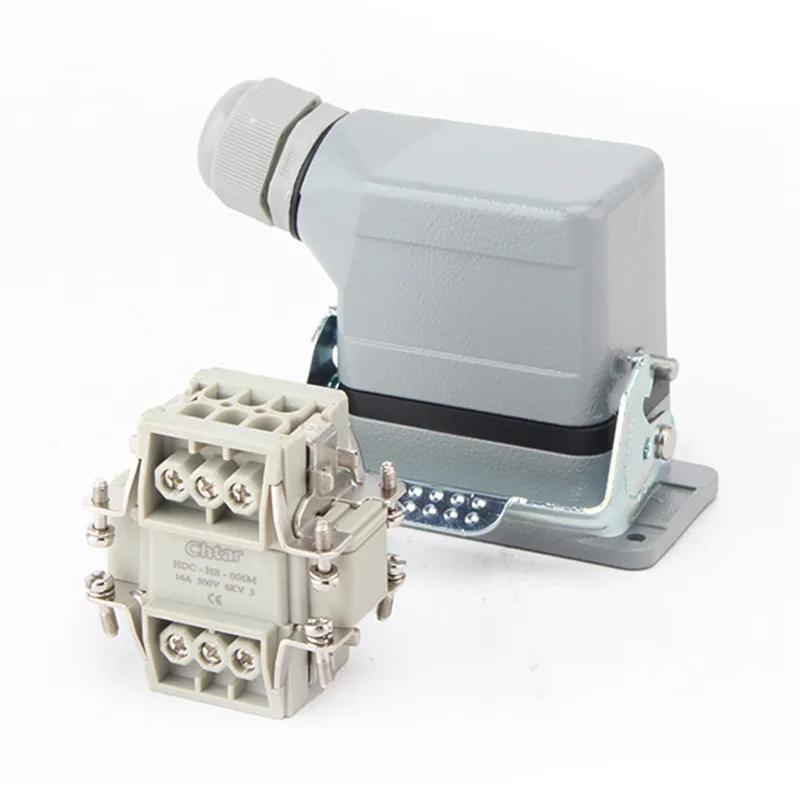 Te 6-pinowe złącza CHTAR AG o dużej wytrzymałości są szeroko stosowane w HE HD HEE, HDD. Jest to podstawa i żeńska część obudowy wytrzymałych złączy. Wykonane jest z aluminium i zaprojektowane jako pojedyncza klamra. Przyjazny dla użytkownika rodzaj listwy zaciskowej o dużej wytrzymałości.
