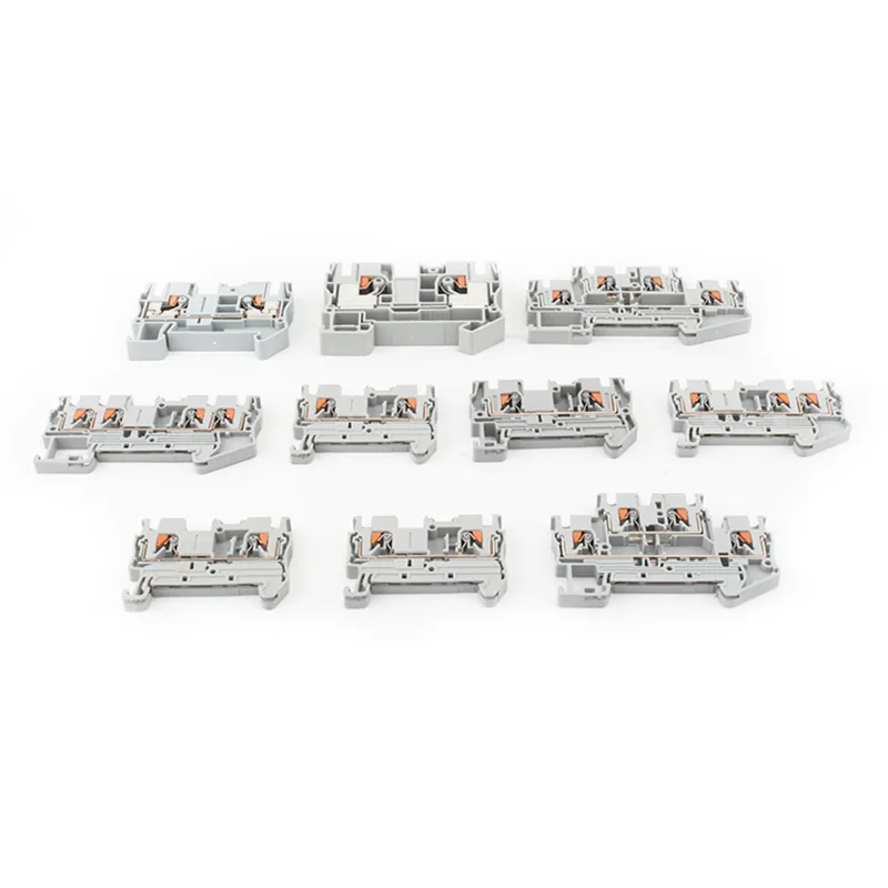 Blok zacisków przelotowych na szynę DIN PT 10 wykorzystuje technologię połączeń wciskanych, która upraszcza okablowanie — nie są potrzebne żadne narzędzia. Użytkownicy mogą bezpośrednio włożyć przygotowany drut, a zintegrowany mechanizm zacisku sprężynowego bezpiecznie go blokuje. W porównaniu do połączeń śrubowych ta innowacja radykalnie zwiększa wydajność, skracając czas okablowania nawet o 80% i zmniejszając siłę wstawiania o około połowę. Rezultatem jest szybsza integracja i niższy nakład siły roboczej.
