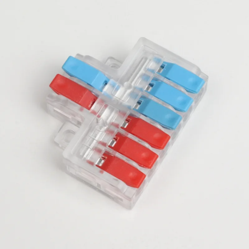 CHTAR Szybkozłącza mini drutu z dwoma wejściami i czterema wyjściami są wykonane z poliwęglanowej powłoki i nylonowych dźwigni. Obydwa tworzywa sztuczne to materiały klasy UL94 V0. Części metalowe przewodzą prąd, a wewnątrz znajdują się sprężyny wykonane z miedzi T2 z powłoką cynową i sprężyną S301.