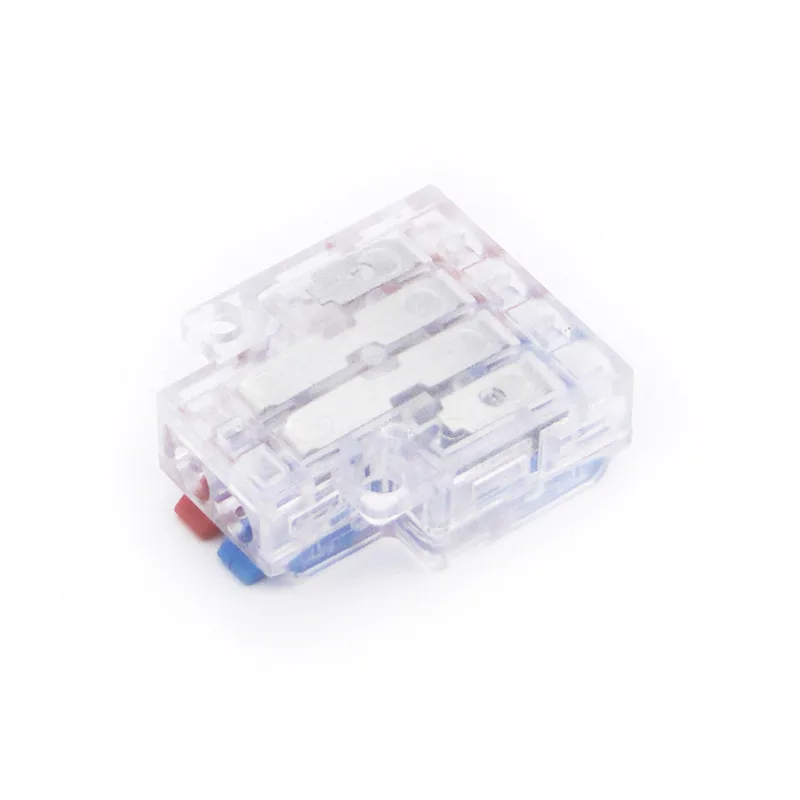 CHTAR Szybkozłącza z dwoma wejściami i czterema wyjściami są wykonane z poliwęglanowej powłoki i nylonowych dźwigni. Obydwa tworzywa sztuczne to materiały klasy UL94 V0. Części metalowe przewodzą prąd, a wewnątrz znajdują się sprężyny wykonane z miedzi T2 z powłoką cynową i sprężyną S301.